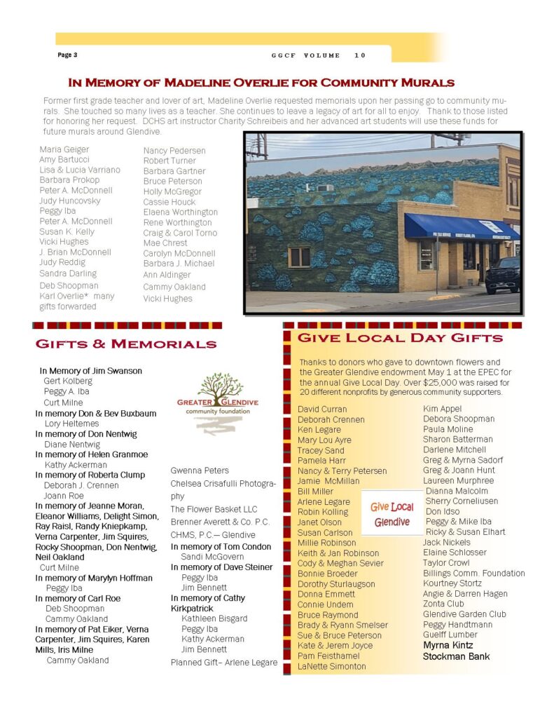 The GGCF newsletter highlights recent projects, local donors, grant impacts, memorials, and upcoming community events.